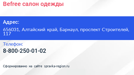 Befree, салон одежды по адресу 656031, Алтайский край, Барнаул, проспект Строителей, 117 в дальнейшем Организация, размещена в следующих категориях:
