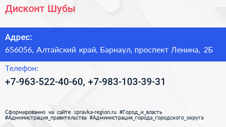 Дисконт-Шубы по адресу 656056, Алтайский край, Барнаул, проспект Ленина, 2Б в дальнейшем Организация, размещена в следующих категориях: