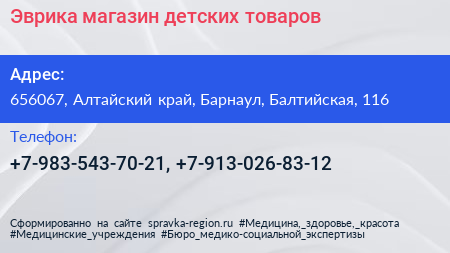 Эврика, магазин детских товаров по адресу 656067, Алтайский край, Барнаул, Балтийская, 116 в дальнейшем Организация, размещена в следующих категориях: