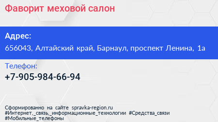 Фаворит, меховой салон по адресу 656043, Алтайский край, Барнаул, проспект Ленина, 1а в дальнейшем Организация, размещена в следующих категориях: