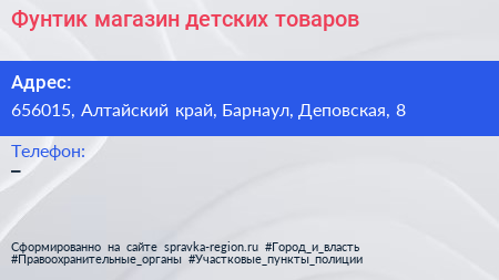 Фунтик, магазин детских товаров по адресу 656015, Алтайский край, Барнаул, Деповская, 8 в дальнейшем Организация, размещена в следующих категориях: