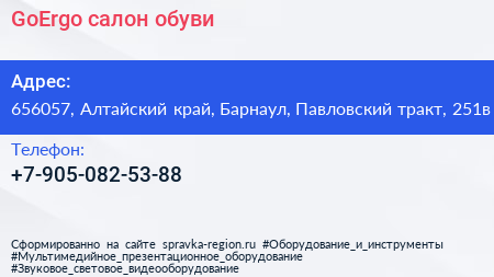 GoErgo, салон обуви по адресу 656057, Алтайский край, Барнаул, Павловский тракт, 251в в дальнейшем Организация, размещена в следующих категориях: