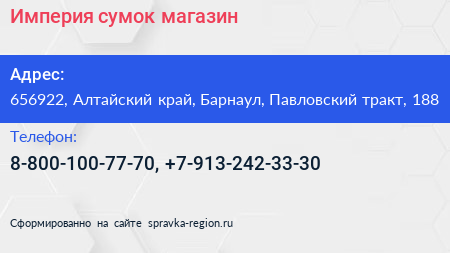 Империя сумок, магазин по адресу 656922, Алтайский край, Барнаул, Павловский тракт, 188 в дальнейшем Организация, размещена в следующих категориях: