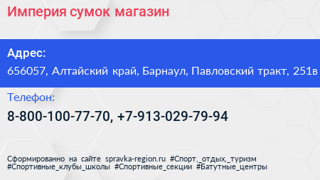 Империя сумок, магазин по адресу 656057, Алтайский край, Барнаул, Павловский тракт, 251в в дальнейшем Организация, размещена в следующих категориях: