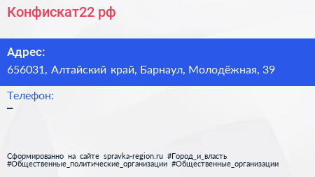 Конфискат22.рф по адресу 656031, Алтайский край, Барнаул, Молодёжная, 39 в дальнейшем Организация, размещена в следующих категориях:
