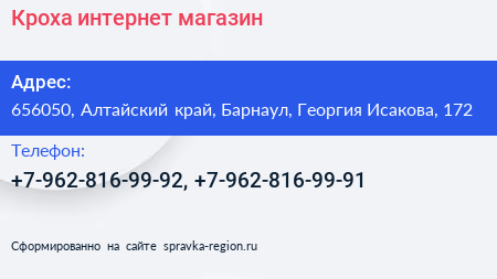 Кроха, интернет-магазин по адресу 656050, Алтайский край, Барнаул, Георгия Исакова, 172 в дальнейшем Организация, размещена в следующих категориях: