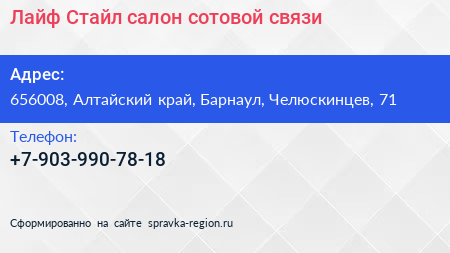 Лайф Стайл, салон сотовой связи по адресу 656008, Алтайский край, Барнаул, Челюскинцев, 71 в дальнейшем Организация, размещена в следующих категориях: