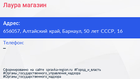 Лаура, магазин по адресу 656057, Алтайский край, Барнаул, 50 лет СССР, 16 в дальнейшем Организация, размещена в следующих категориях:
