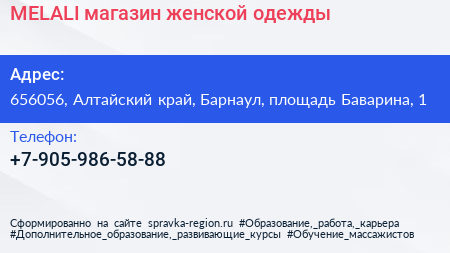 MELALI, магазин женской одежды по адресу 656056, Алтайский край, Барнаул, площадь Баварина, 1 в дальнейшем Организация, размещена в следующих категориях:
