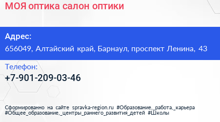 МОЯ оптика, салон оптики по адресу 656049, Алтайский край, Барнаул, проспект Ленина, 43 в дальнейшем Организация, размещена в следующих категориях:
