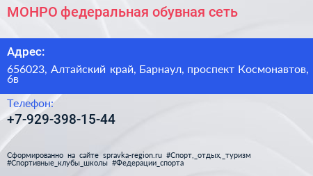 МОНРО, федеральная обувная сеть по адресу 656023, Алтайский край, Барнаул, проспект Космонавтов, 6в в дальнейшем Организация, размещена в следующих категориях: