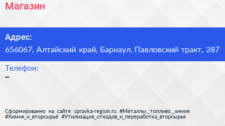 Магазин по адресу 656067, Алтайский край, Барнаул, Павловский тракт, 287 в дальнейшем Организация, размещена в следующих категориях:
