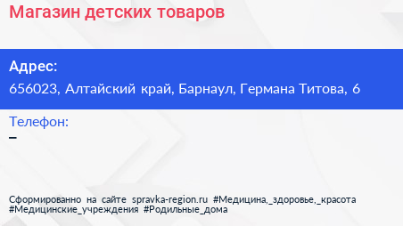 Магазин детских товаров по адресу 656023, Алтайский край, Барнаул, Германа Титова, 6 в дальнейшем Организация, размещена в следующих категориях: