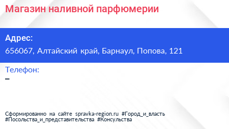 Магазин наливной парфюмерии по адресу 656067, Алтайский край, Барнаул, Попова, 121 в дальнейшем Организация, размещена в следующих категориях: