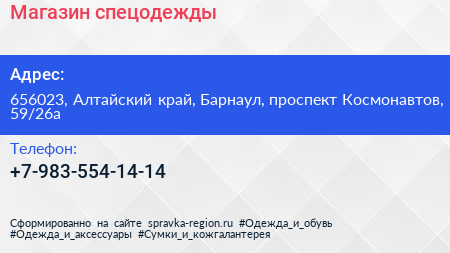 Магазин спецодежды по адресу 656023, Алтайский край, Барнаул, проспект Космонавтов, 59/26а в дальнейшем Организация, размещена в следующих категориях: