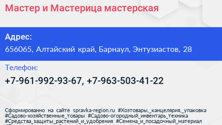 Мастер и Мастерица, мастерская по адресу 656065, Алтайский край, Барнаул, Энтузиастов, 28 в дальнейшем Организация, размещена в следующих категориях: