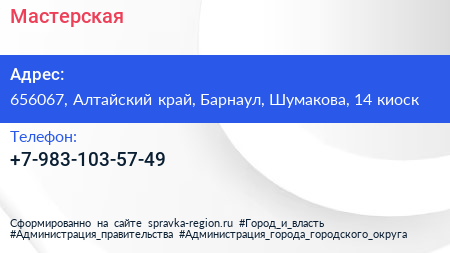 Мастерская по адресу 656067, Алтайский край, Барнаул, Шумакова, 14 киоск в дальнейшем Организация, размещена в следующих категориях: