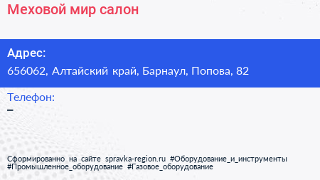 Меховой мир, салон по адресу 656062, Алтайский край, Барнаул, Попова, 82 в дальнейшем Организация, размещена в следующих категориях: