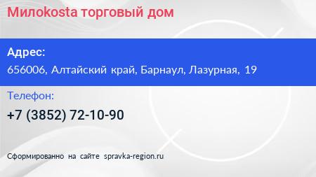 Милоkosta, торговый дом по адресу 656006, Алтайский край, Барнаул, Лазурная, 19 в дальнейшем Организация, размещена в следующих категориях: