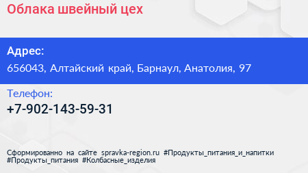 Облака, швейный цех по адресу 656043, Алтайский край, Барнаул, Анатолия, 97 в дальнейшем Организация, размещена в следующих категориях: