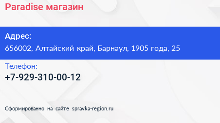 Paradise, магазин по адресу 656002, Алтайский край, Барнаул, 1905 года, 25 в дальнейшем Организация, размещена в следующих категориях: