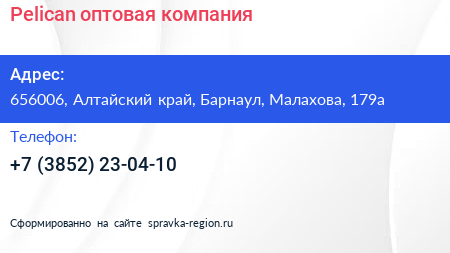 Pelican, оптовая компания по адресу 656006, Алтайский край, Барнаул, Малахова, 179а в дальнейшем Организация, размещена в следующих категориях: