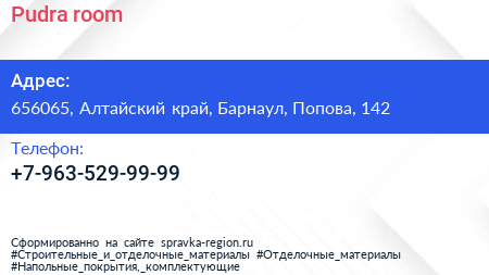 Pudra room по адресу 656065, Алтайский край, Барнаул, Попова, 142 в дальнейшем Организация, размещена в следующих категориях: