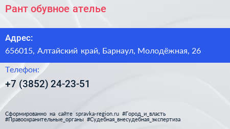 Рант, обувное ателье по адресу 656015, Алтайский край, Барнаул, Молодёжная, 26 в дальнейшем Организация, размещена в следующих категориях: