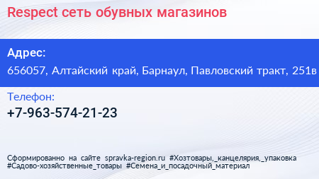 Respect, сеть обувных магазинов по адресу 656057, Алтайский край, Барнаул, Павловский тракт, 251в в дальнейшем Организация, размещена в следующих категориях: