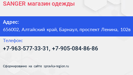 SANGER, магазин одежды по адресу 656002, Алтайский край, Барнаул, проспект Ленина, 102в в дальнейшем Организация, размещена в следующих категориях: