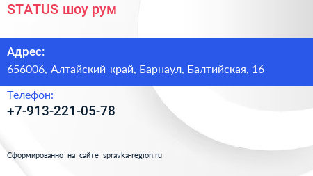 STATUS, шоу-рум по адресу 656006, Алтайский край, Барнаул, Балтийская, 16 в дальнейшем Организация, размещена в следующих категориях: