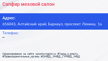 Сапфир, меховой салон по адресу 656043, Алтайский край, Барнаул, проспект Ленина, 1а в дальнейшем Организация, размещена в следующих категориях: