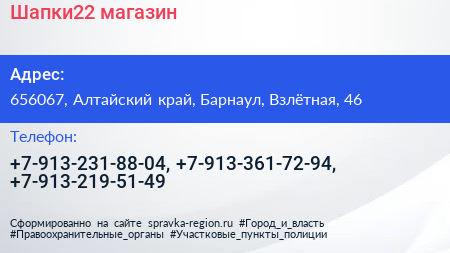 Шапки22, магазин по адресу 656067, Алтайский край, Барнаул, Взлётная, 46 в дальнейшем Организация, размещена в следующих категориях: