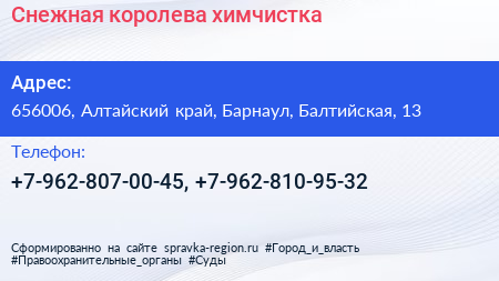 Снежная королева, химчистка по адресу 656006, Алтайский край, Барнаул, Балтийская, 13 в дальнейшем Организация, размещена в следующих категориях: