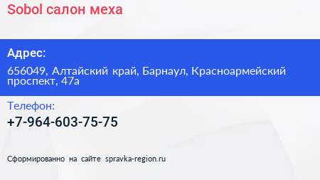 Sobol, салон меха по адресу 656049, Алтайский край, Барнаул, Красноармейский проспект, 47а в дальнейшем Организация, размещена в следующих категориях: