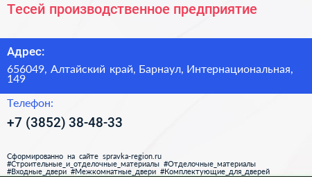 Тесей, производственное предприятие по адресу 656049, Алтайский край, Барнаул, Интернациональная, 149 в дальнейшем Организация, размещена в следующих категориях: