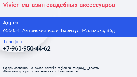 Vivien, магазин свадебных аксессуаров по адресу 656054, Алтайский край, Барнаул, Малахова, 86д в дальнейшем Организация, размещена в следующих категориях: