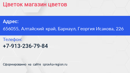 Цветок, магазин цветов по адресу 656055, Алтайский край, Барнаул, Георгия Исакова, 226 в дальнейшем Организация, размещена в следующих категориях: