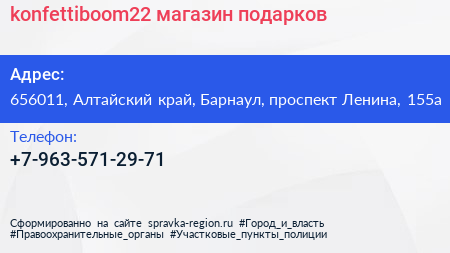 konfettiboom22, магазин подарков по адресу 656011, Алтайский край, Барнаул, проспект Ленина, 155а в дальнейшем Организация, размещена в следующих категориях: