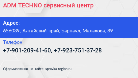 ADM TECHNO, сервисный центр по адресу 656039, Алтайский край, Барнаул, Малахова, 89 в дальнейшем Организация, размещена в следующих категориях: