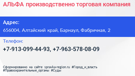 АЛЬФА, производственно-торговая компания по адресу 656004, Алтайский край, Барнаул, Фабричная, 2 в дальнейшем Организация, размещена в следующих категориях:
