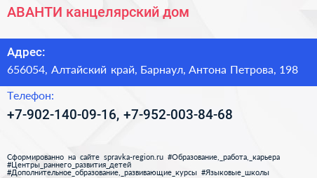 АВАНТИ, канцелярский дом по адресу 656054, Алтайский край, Барнаул, Антона Петрова, 198 в дальнейшем Организация, размещена в следующих категориях: