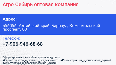 Агро-Сибирь, оптовая компания по адресу 656056, Алтайский край, Барнаул, Комсомольский проспект, 80 в дальнейшем Организация, размещена в следующих категориях: