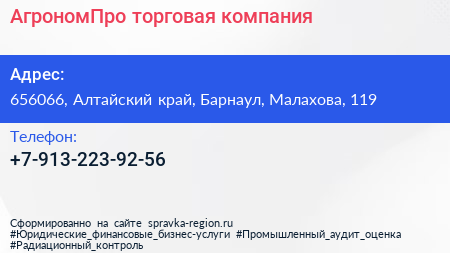 АгрономПро, торговая компания по адресу 656066, Алтайский край, Барнаул, Малахова, 119 в дальнейшем Организация, размещена в следующих категориях: