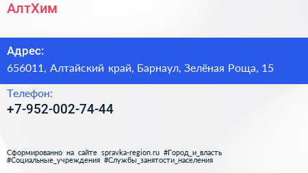 АлтХим по адресу 656011, Алтайский край, Барнаул, Зелёная Роща, 15 в дальнейшем Организация, размещена в следующих категориях: