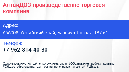 АлтайДОЗ, производственно-торговая компания по адресу 656008, Алтайский край, Барнаул, Гоголя, 187 к1 в дальнейшем Организация, размещена в следующих категориях: