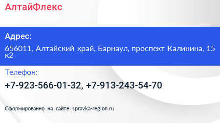 АлтайФлекс по адресу 656011, Алтайский край, Барнаул, проспект Калинина, 15 к2 в дальнейшем Организация, размещена в следующих категориях: