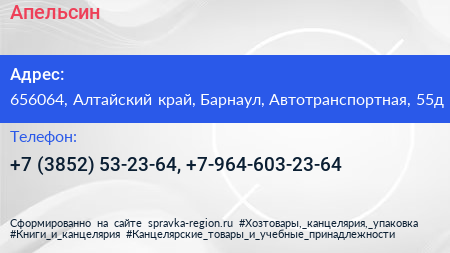 Апельсин по адресу 656064, Алтайский край, Барнаул, Автотранспортная, 55д в дальнейшем Организация, размещена в следующих категориях: