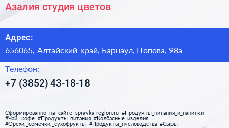 Азалия, студия цветов по адресу 656065, Алтайский край, Барнаул, Попова, 98а в дальнейшем Организация, размещена в следующих категориях: