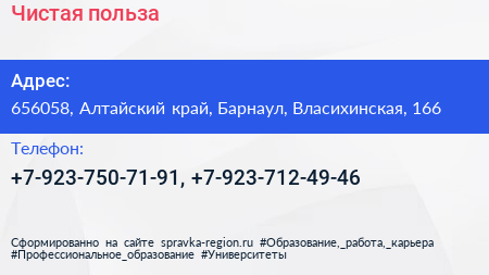 Чистая польза по адресу 656058, Алтайский край, Барнаул, Власихинская, 166 в дальнейшем Организация, размещена в следующих категориях: